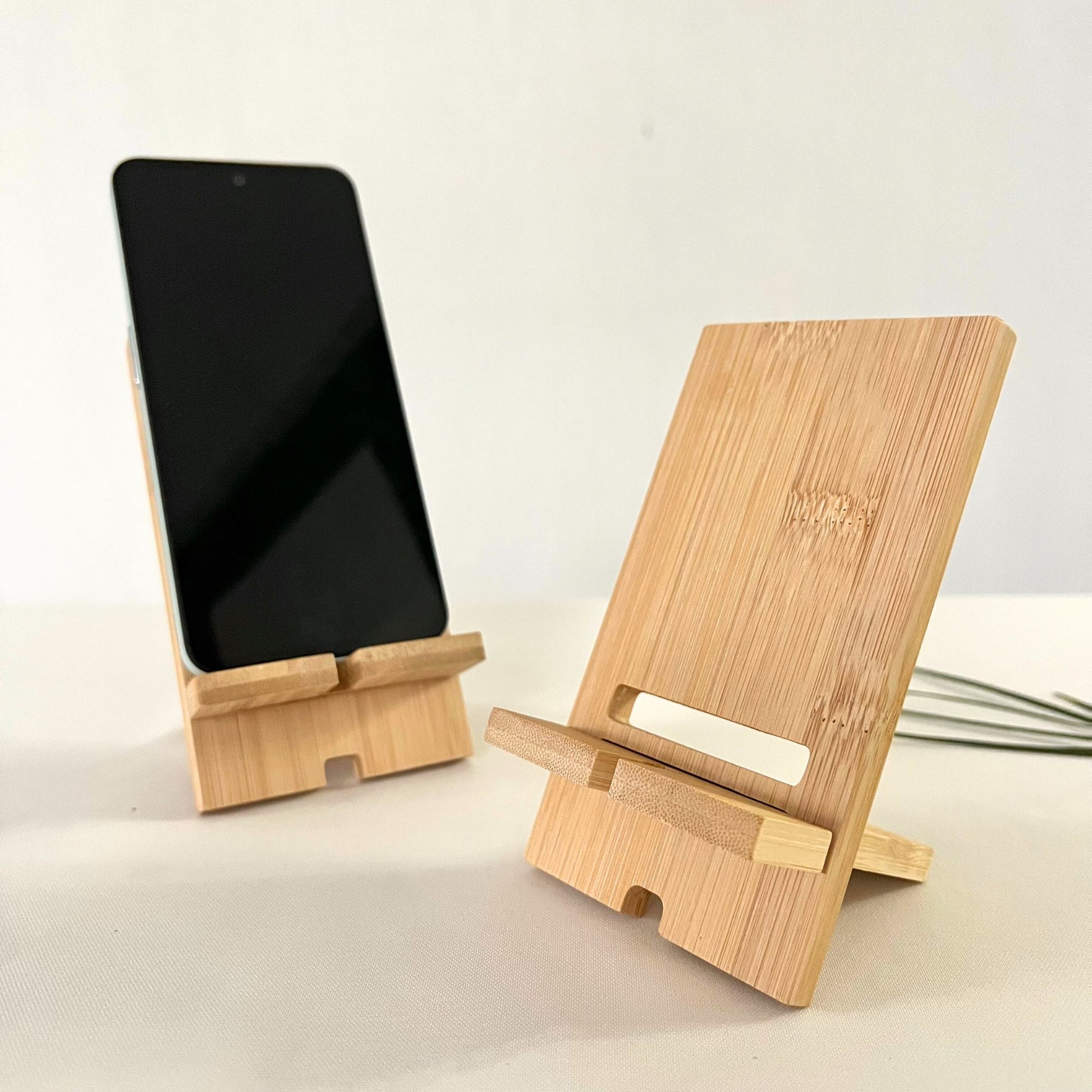 Crafted from natural bamboo, our phone stand is built sturdy to keep your device upright—whether for work, rest, or play. Thoughtfully designed with slots for charging and cord management.